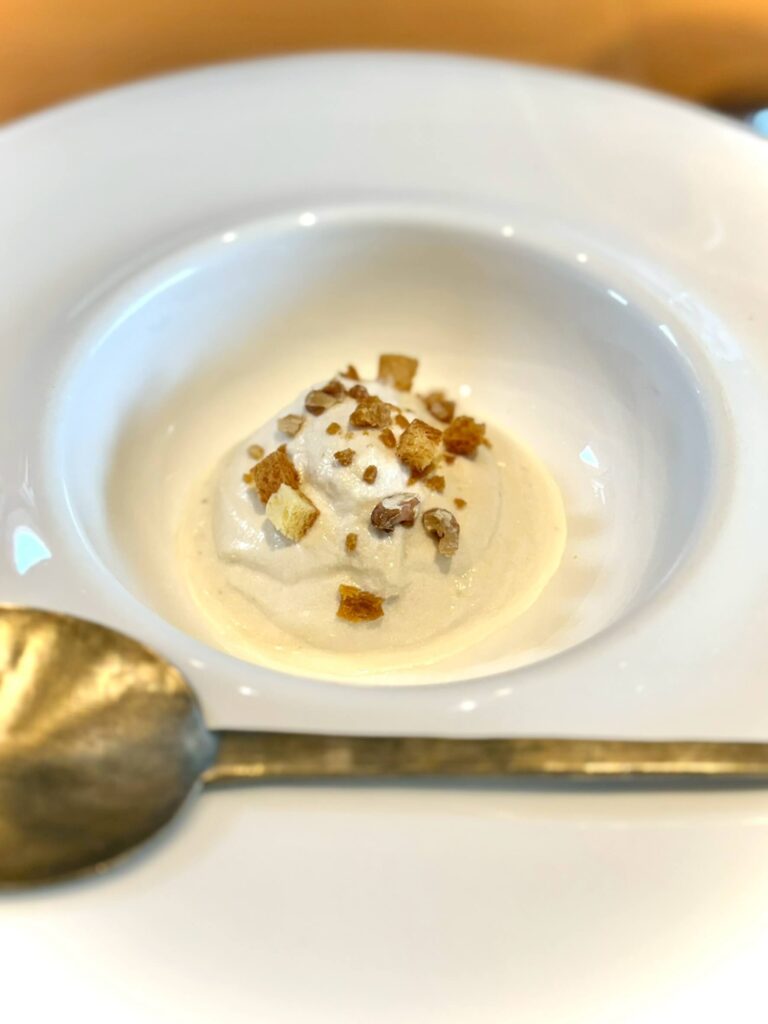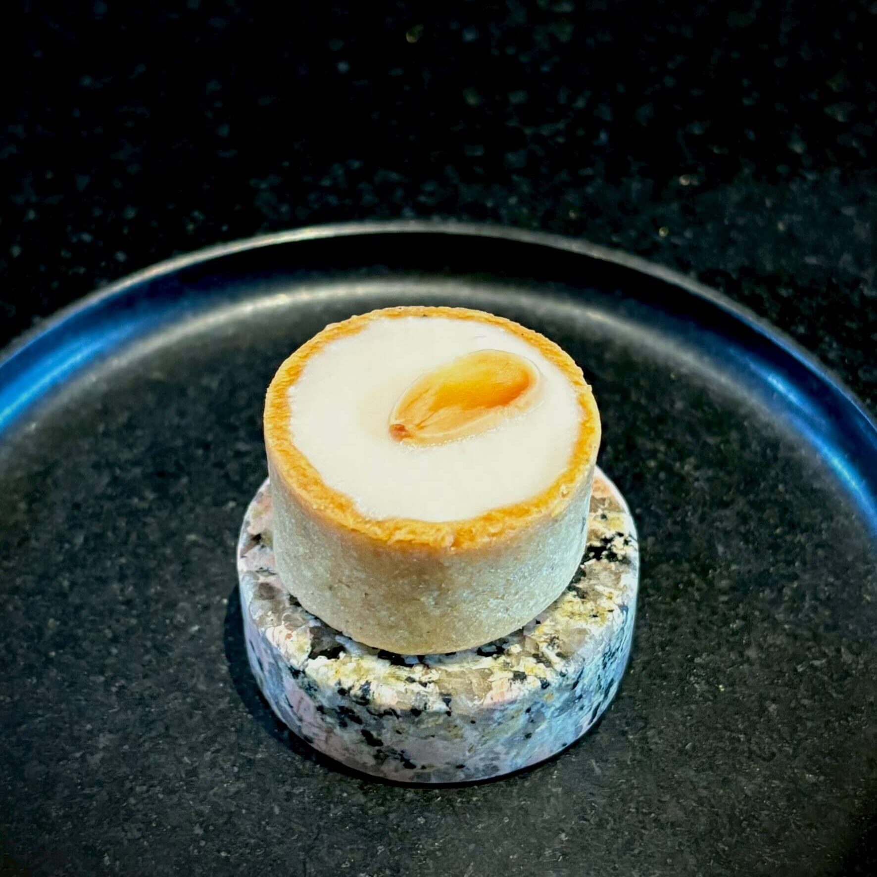 カリフラワーとチーズのブランマンジェの上にはアーモンドが載っており、手でつまんで頂きます。