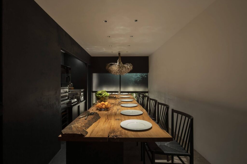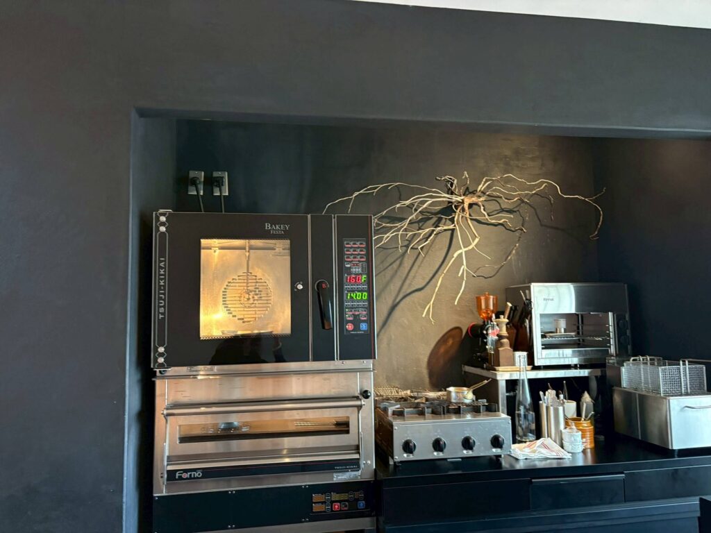 店内に一歩足を踏み入れると、大きな木のカウンターと頭上に吊るされた古木が印象的な、洗練された空間が広がります。