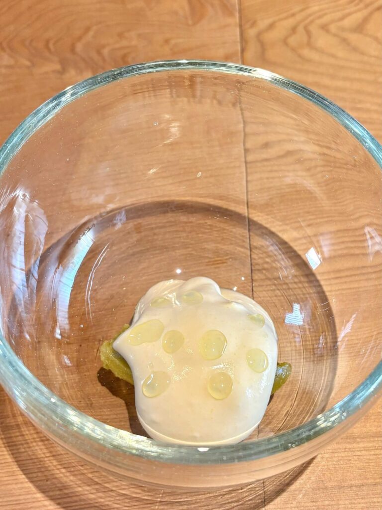 セロリのソルベの上にサバイヨンソースとバジルソースが香る一品。