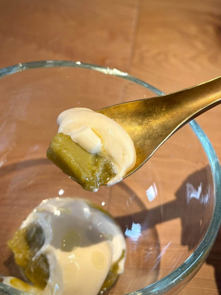 ふわっとしたムースと冷たいアイスを舌の上で楽しんでいるとやがてカラスミの塩味が。