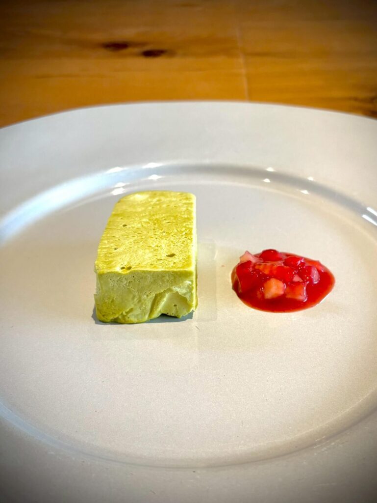 二つ目のデザートは、ピスタチオとワサビのムースグラッセ、苺とフランボワーズのソース。