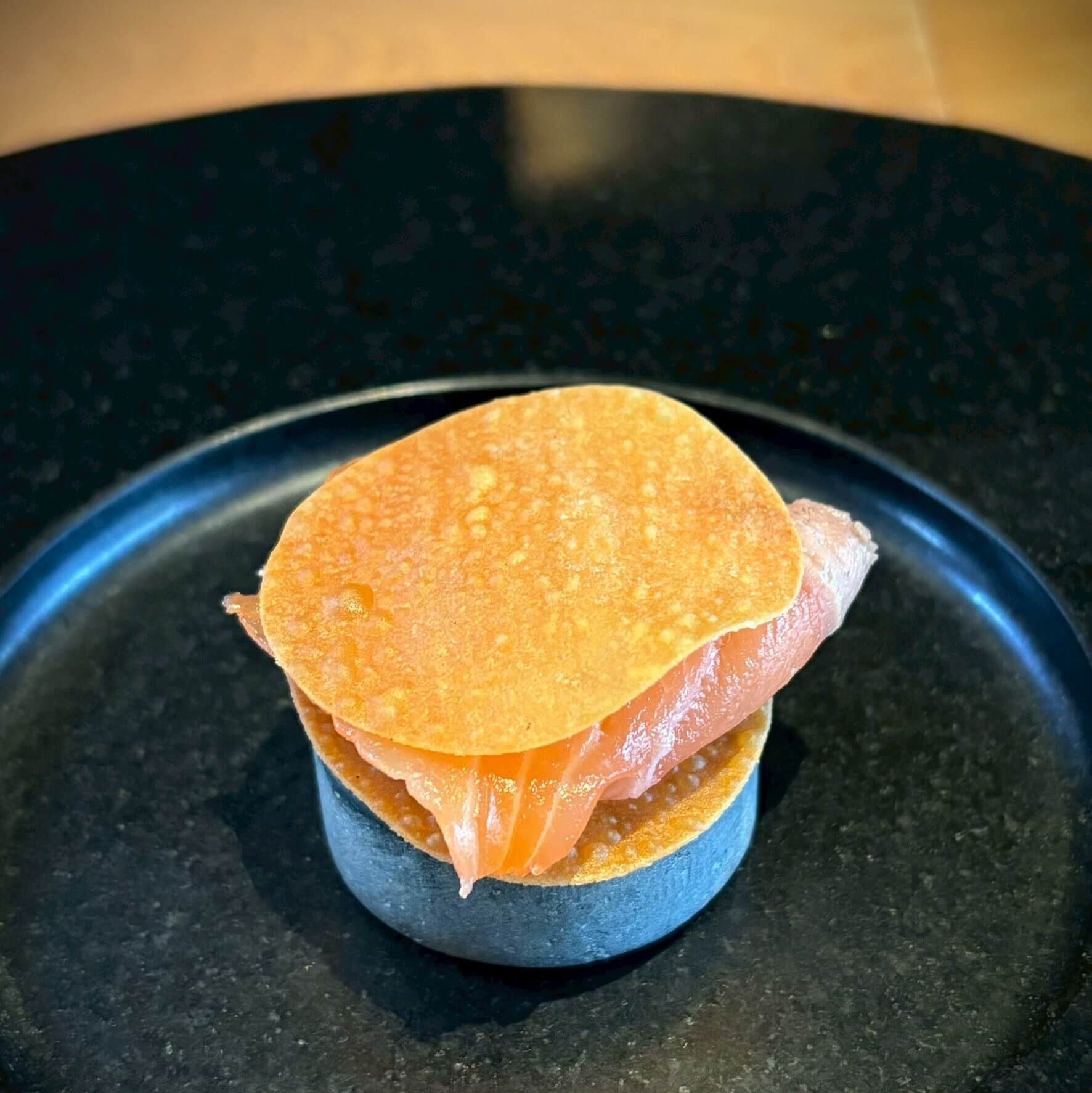 次は塩麴でマリネしたサーモンと八角で香り付けしたクリームを、焼いたラビオリ生地でサンドした一品。