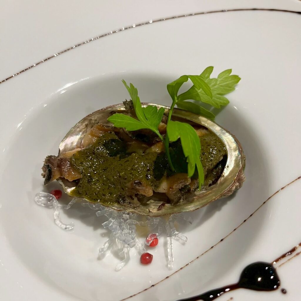 肝と香草バターの香りがふんわり広がり、磯の旨味と鉄板の香ばしさが心地よく調和しています。